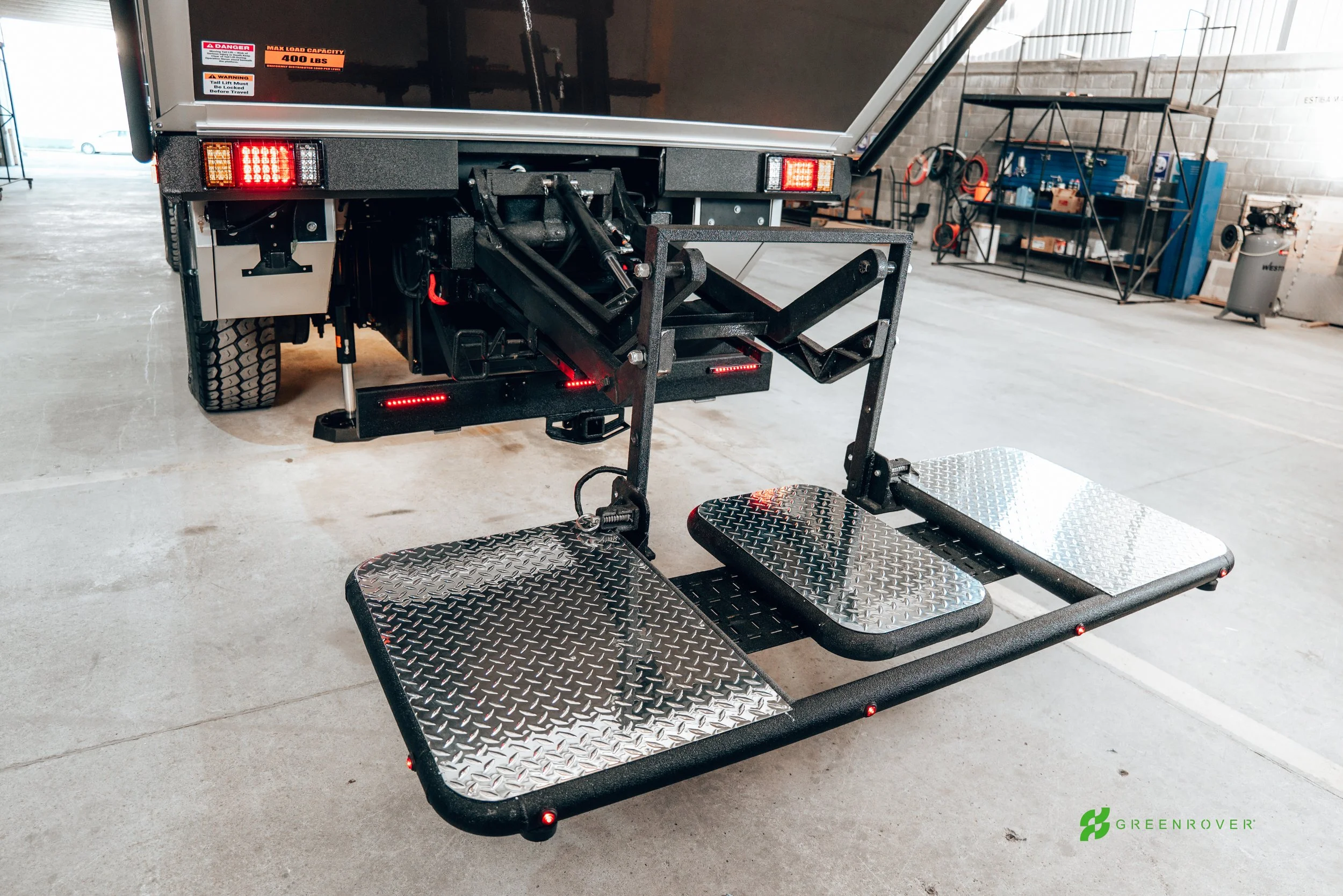 Heavy-Duty Rear Lifting Platfor. Secure rooftop storage pod accessible via side stair keeps everyday gear clean and protected. A hydraulic rear platform hauls heavy loads — from motorcycles to kayaks — with ease and safety.