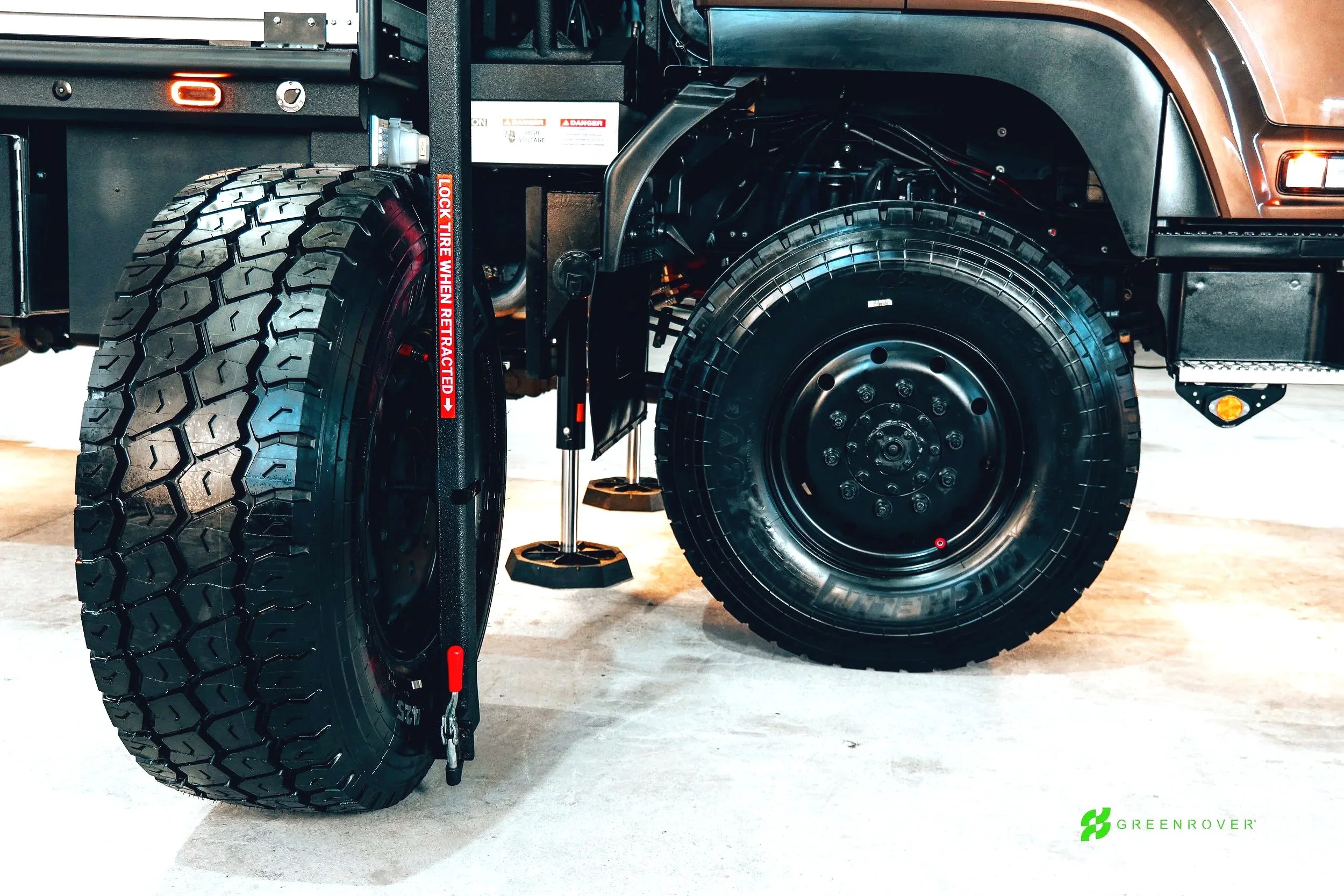 Equipped with 10-hole hub pilot wheel ends and exchange to 425/65R22.5 tires mounted on polished aluminum wheels. Includes a full-size spare for reliability on long expeditions. Powder-coated satin black finish enhances durability and style.