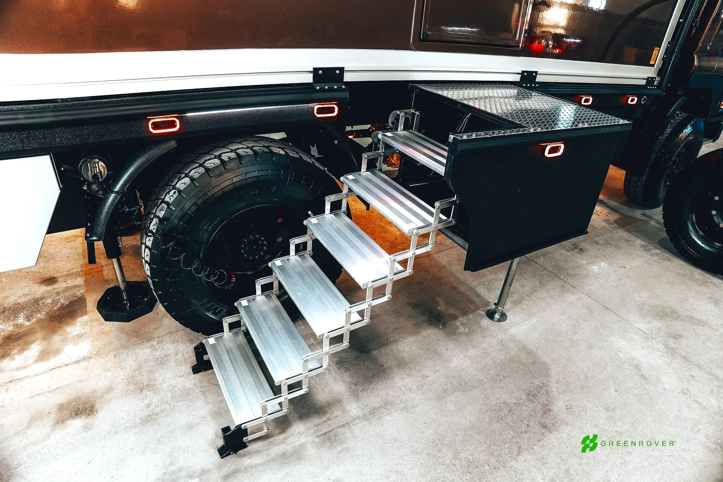 Getting in and out of your expedition vehicle should be as easy as the adventures you take it on. PowerStep replaces traditional, bulky RV steps with a sleek, motorized system that automatically extends and retracts, offering secure, convenient access at the touch of a button — or even hands-free. Built for rugged environments and integrated into your GreenRover’s security system, PowerStep keeps you moving smoothly and safely wherever you roam.